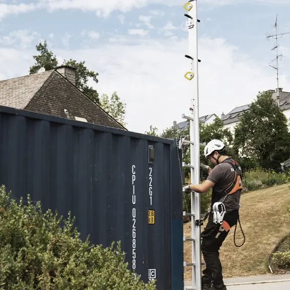 La protección contra caídas en la industria logística y de almacenamiento es esencial debido a los riesgos de trabajar con maquinaria en altura y el mantenimiento de sistemas automatizados. El sistema SecuRail proporciona acceso seguro en estanterías automatizadas, mientras que SafeAccess y Flexbow garantizan seguridad en muelles de carga. Con bloques de seguridad, SafeAccess ofrece detención confiable de caídas. Para la logística robotizada, SafeLadder Pro mejora la seguridad en el mantenimiento de equipos robóticos. Estas soluciones contribuyen a un entorno de trabajo más seguro en la industria de almacenamiento y cumplimiento.